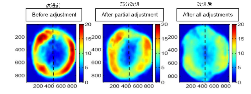 传统压力分布检测采用压敏薄膜(压敏纸),受压后颜色密度与压力呈单调关系,能记录整个晶圆表面的压力 “印记”。工程师将压敏薄膜置于键合界面,通过平板扫描仪和标定色卡,生成彩色压力图,可量化中心-边缘差异;通过识别图像并采取一系列压力均匀性改进手段,并记录每次测试,测试结果显示压力的均匀性得到了提高。